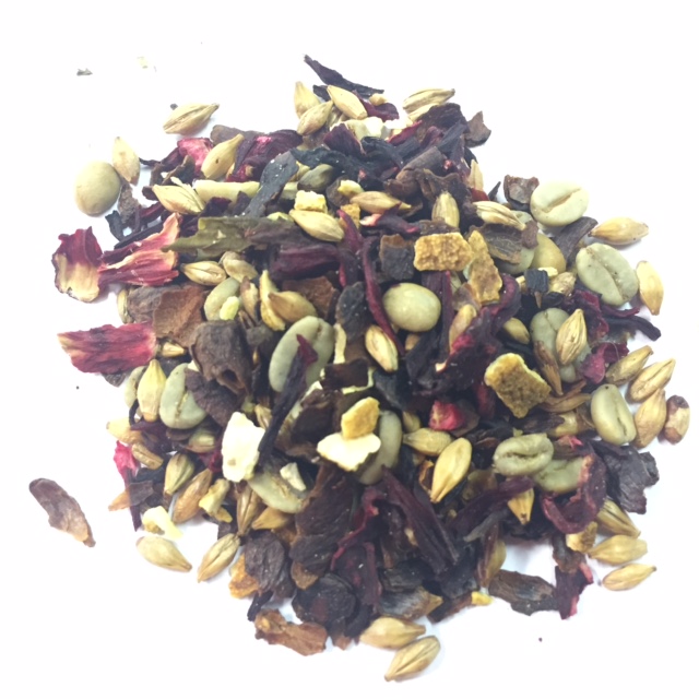 Kaffeekirschen, Gerstenmalz, Hibiskusblüten, Orangenschalen (10%), kalt gepresstes Bio-Orangenöl (3%)