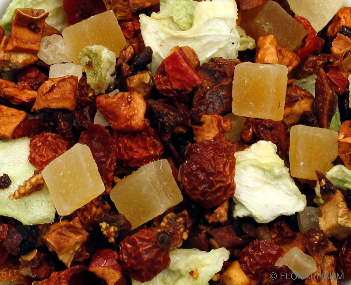 Birnenstücke (25%), Apfelstücke (Apfel, Säuerungsmittel: Zitronensäure), kandierte Ananasstücke (Ananas, Zucker), kandierte Mangostücke (Mango, Zucker), Galiamelonenstücke, Hagebuttenschalen, natürliches Aroma, Kiwistücke (1,5%).