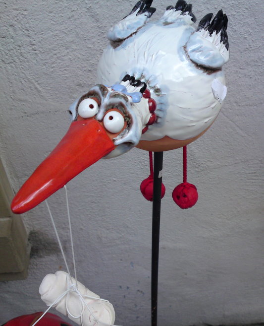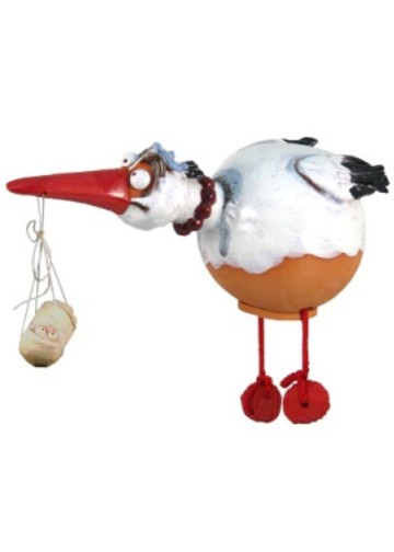 Der Storch hat stilisierte Beine aus roter Schnur und wirken so besonders treffend, Am schnabel ist ein Babybündel befestigt.