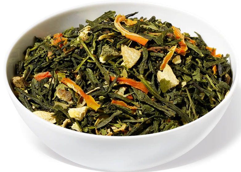 Milder Sencha, kombiniert mit spritzigen Zitrusschalen, Zitronenmyrte und würzigem Ingwer, abgerundet mit lieblichem Zimt und feinen Karottenstreifen. Aus kontrolliert biologischem Anbau.