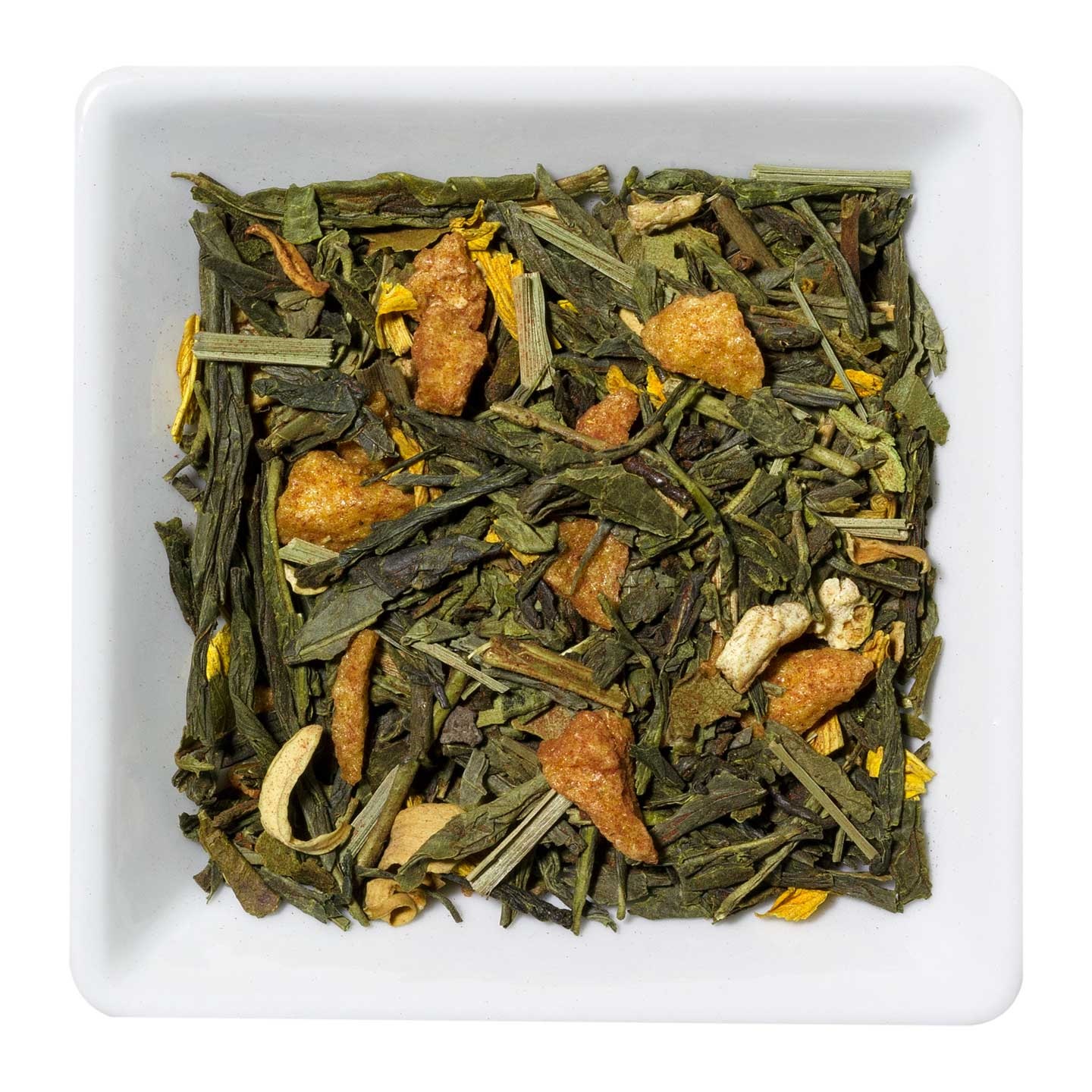 Feiner, milder Sencha, harmonisch abgerundet mit fruchtig-frischem Orangengeschmack und leichter Ingwernote.