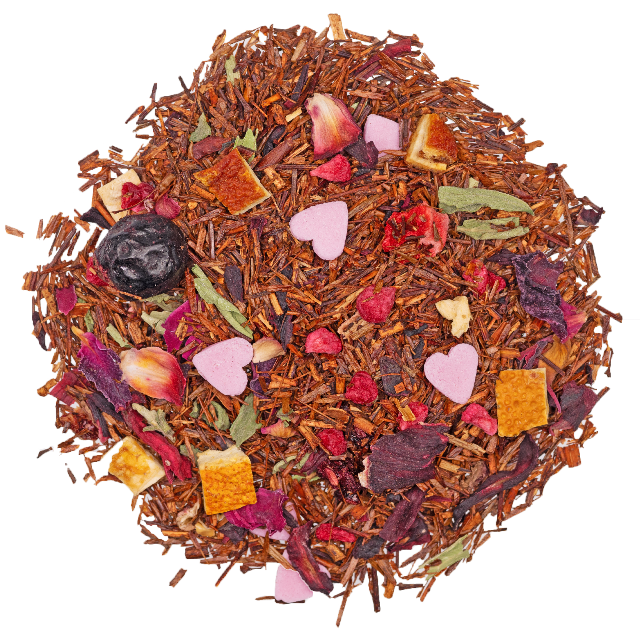 Rooibos, Hibiskusblüten, Aroma, Orangenschalen, Zuckerherzen (Zucker, Reismehl, Kakaobutter, Kartoffelstärke, färbendes Lebensmittel (rote Beete Saftkonzentrat)), Süßkraut, Erdbeerstücke, Himbeerstücke(1%), Rosenblütenblätter, schwarze Johannisbeeren(1%), Brombeerstücke